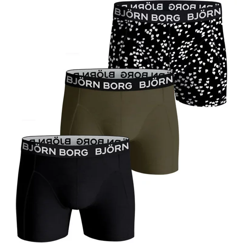 Björn Borg Heren Boxershorts 3-Pack – Multi Comfort en stijl in één set De Björn Borg Heren Boxershorts 3-Pack combineert tijdloos design met ultiem draagcomfort. Deze set bevat drie boxershorts in diverse kleuren en prints, perfect voor dagelijks gebruik: * 1x Zwart * 1x Groen * 1x Zwart met hartjes print Gemaakt van een zachte katoen-stretch kwaliteit, bieden deze boxers een normale pasvorm met een halfhoge taille en halflange pijpen. De elastische tailleband met het iconische Björn Borg-logo zorgt voor extra comfort en een perfecte pasvorm. Belangrijkste kenmerken van de Björn Borg 3-Pack Boxershorts * Set van 3 boxershorts in effen en printdesign * Gemaakt van 95% katoen en 5% elastaan voor optimale stretch en comfort * Normale pasvorm met halfhoge taille en halflange pijpen * Zachte elastische tailleband met Björn Borg-logo * Ademend en duurzaam materiaal voor dagelijks gebruik Waarom kiezen voor Björn Borg