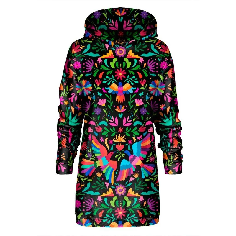 Oversize hoodiejurk van zachte, comfortabele stof voor de hele dag draagplezier. De losse pasvorm en klassieke capuchon bieden maximaal comfort, terwijl de voorzakken praktisch zijn. De volledige print is in de stof verwerkt, waardoor de kleuren duurzaam en helder blijven. Een gezellige en stijlvolle jurk voor thuis of casual uitjes.