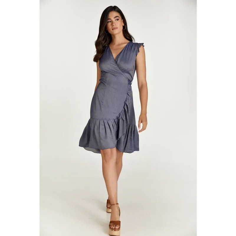 Deze zomerse wikkeljurk is vervaardigd uit geweven viscose in blauwe denimstijl. Het heeft een V-hals en kapmouwtjes met ruches. Deze wikkeljurk heeft een das aan de linkerkant die door een gat aan de rechterkant gaat en die met de rechter das aan de zijkant of aan de achterkant wordt vastgemaakt. Over de hele zoom loopt een ruche van ongeveer 15 cm. De maten voor maat 36/S (in cm) zijn: Schouderbreedte-33, Buste-42, Taille-42, Zoomlijn-70, Lichaamslengte-95/100. 100% viscose