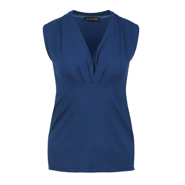 Blauwe CONQUISTA top in stretchstof: viscose-elastaan. Mouwloos met een faux-wrapfront waardoor een diepe V-hals ontstaat. Naad onder de buste. Lengte, voor maat 36/S, 62cm. 92% katoen-%elastan