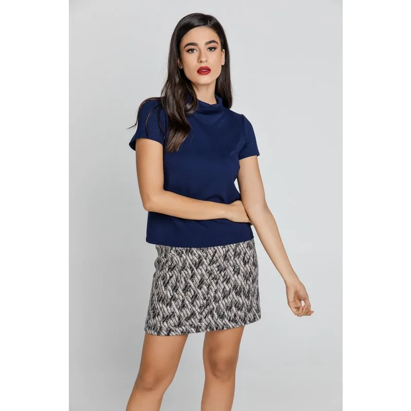Blauwe top van stretchstof. Laag omgeslagen col en korte mouwen. Darts bij de buste. Sluit op de rug met een dikke plastic rits, toon op toon. Recht silhouet. Ons model is 176cm en draagt maat 36/S. Afmetingen voor maat 36/M (in cm): Schouder -36, Borst-43, Taille-45, Onderkant-48, Mouwlengte -16, Lichaamslengte-57. Accessoires zijn niet inbegrepen. 70%viscose-25%polyamid-5%elastan