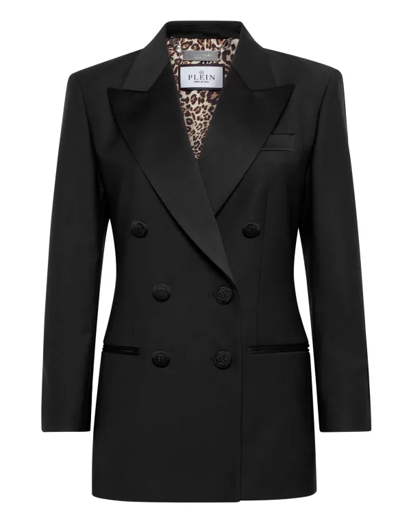 These light wool double brest blazer is a tale of refined elegance. See the care for details. Light wool Shiny satin peak lapels Rhinestones on the back Double breasted with lined buttons with embroidered Logo Two slit pockets Inner lining Fit Boxy