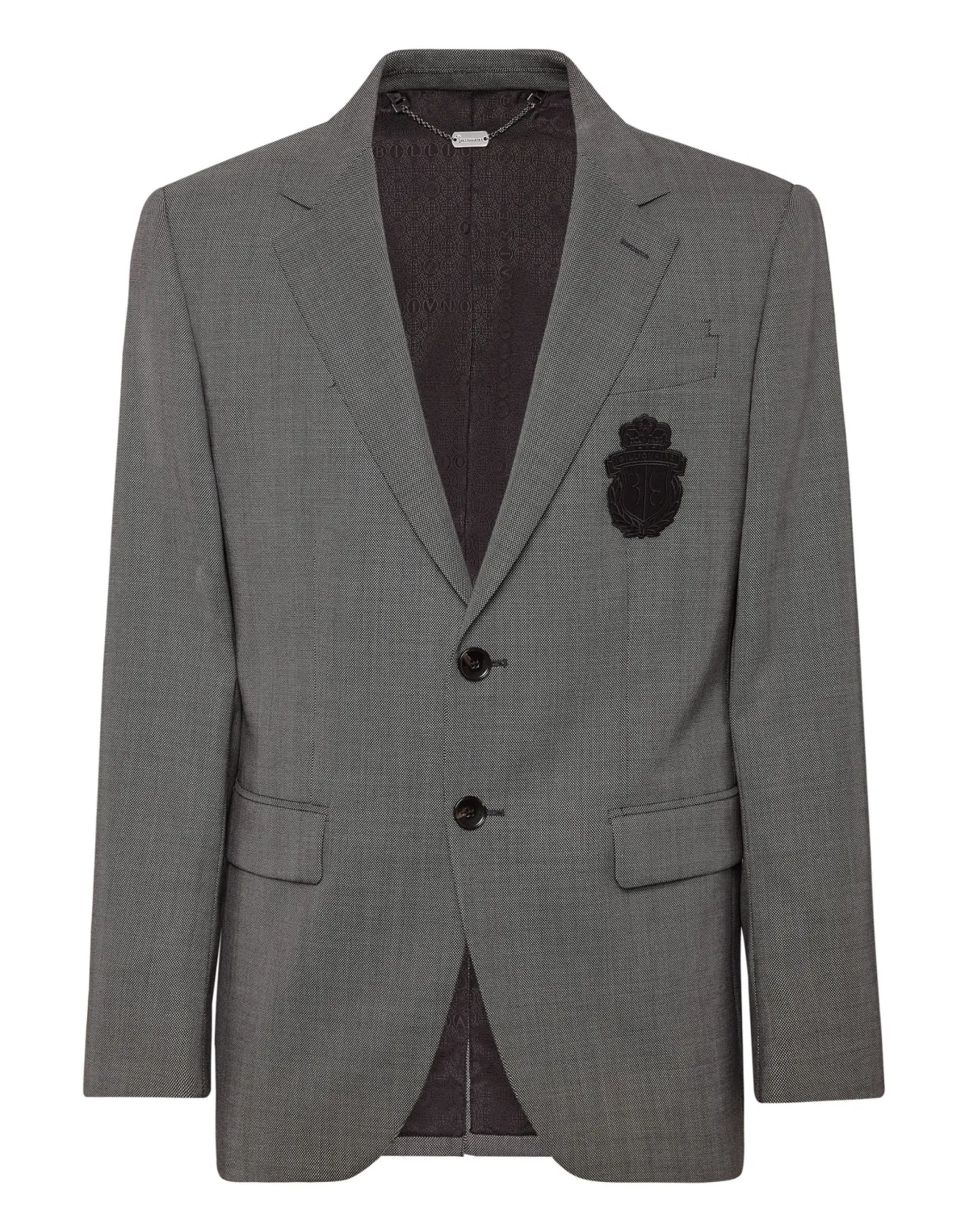 A detail is all you need to make a difference. Check out this precious fabric two button blazer and discover the secrets of elegance. Partridge's eye woven wool Patch with embroidered Crest on the left chest Logoed buttons Two flap pockets Single vent Inner lining