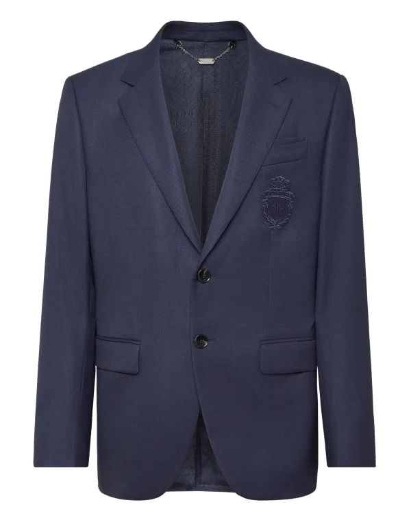 A detail is all you need to make a difference. Check out this precious fabric two button blazer and discover the secrets of elegance. Partridge's eye woven wool Patch with embroidered Crest on the left chest Logoed buttons Two flap pockets Single vent Inner lining