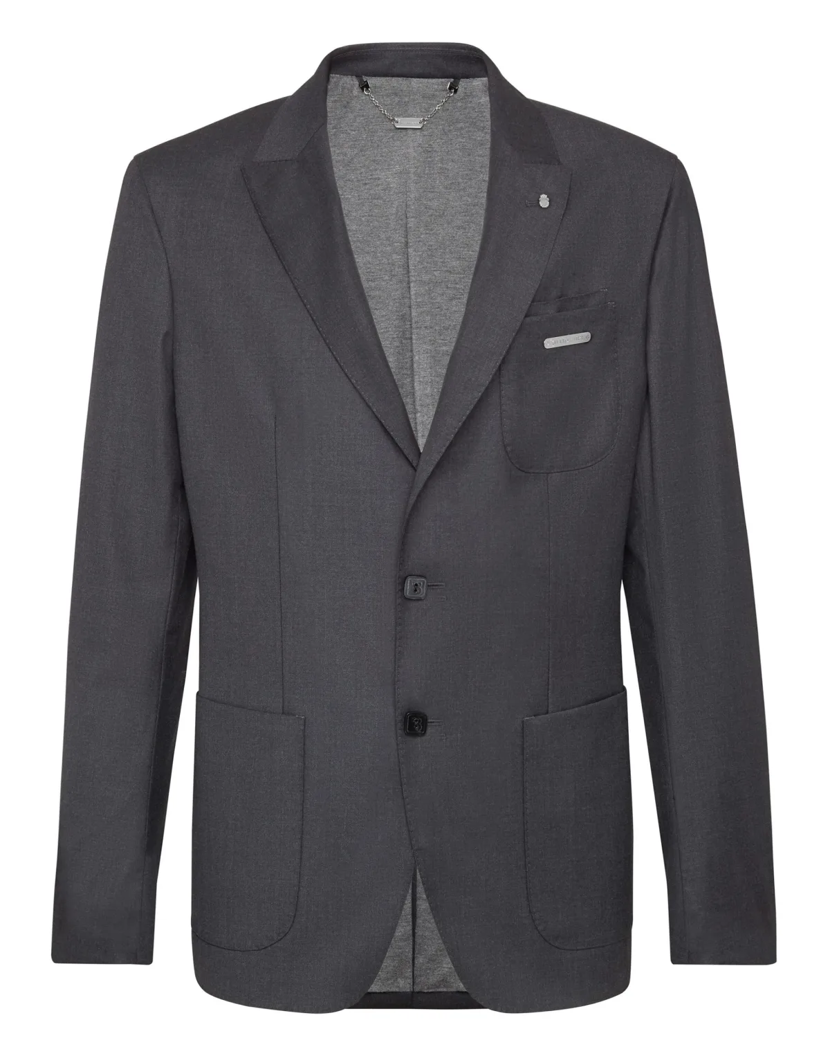 Woollen two button jacket. Patch pockets. A rubberised badge with the brand's lettering is sewn at left chest. The very crest is also featured on buttons. Slit at centre back. Inner lining. Fit: Super Slim.