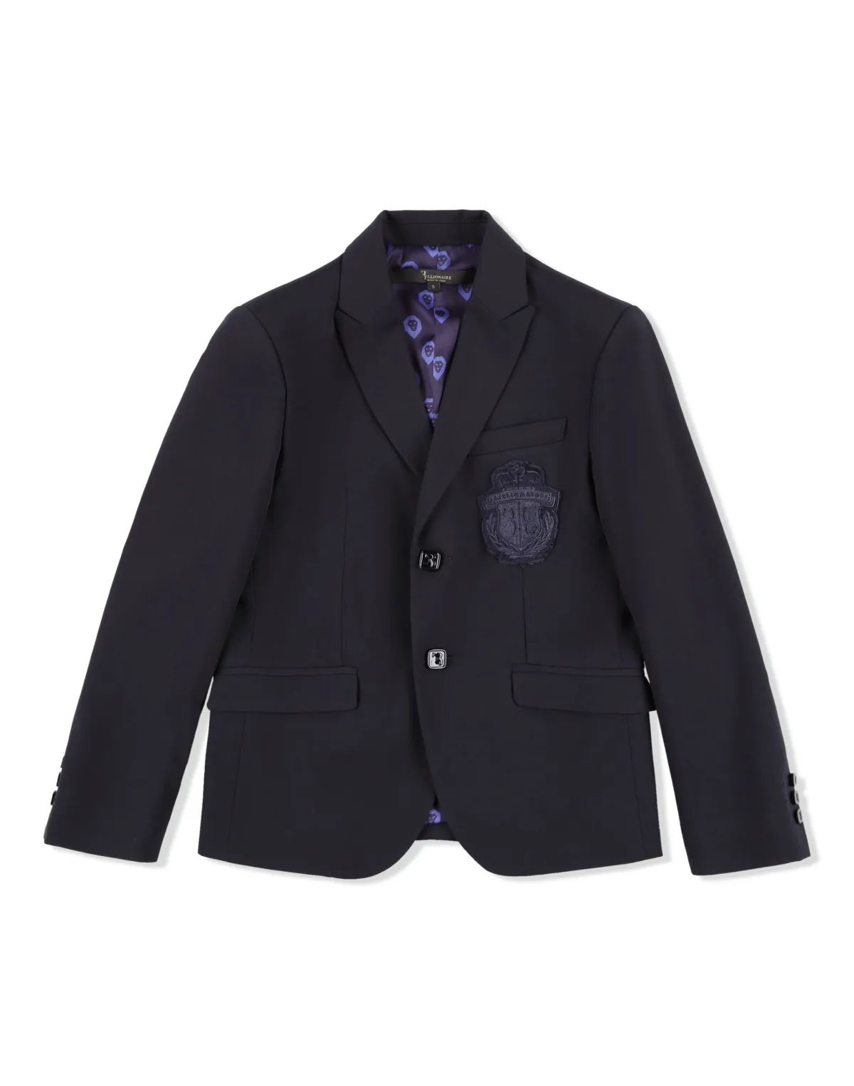 Woollen blazer. Mother of pearl buttons. Embroidered crest patched at the left chest. Two flap pockets. Fully lined.