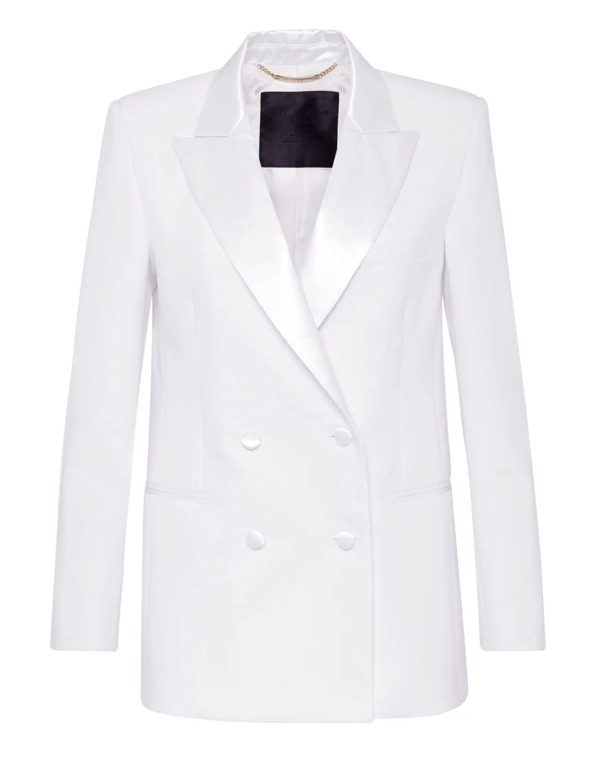 Deze polyester satijnen double breasted blazer heeft een androgyne look door de mannelijke snit. De stof wordt ook binnenstebuiten gebruikt. Twee steekzakken en knopen zijn gevoerd. Binnenvoering.