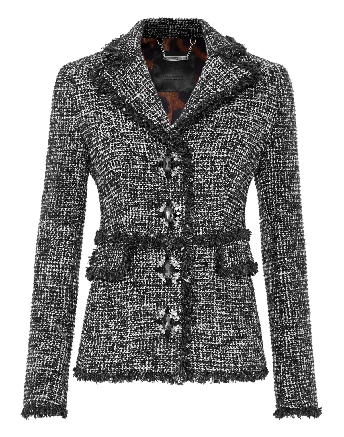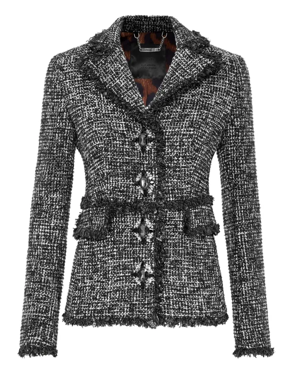 Chique & Rock stijl? Dan is dit het jasje voor jou. We hebben tweed opnieuw ontworpen volgens de stijl van Plein. Bekijk de details. Tweed van polyestermix Enkelrijig met grote strass-broches Twee zakken met klep Franje in de zomen Voering van gemêleerde stof Figuurlijke pasvorm