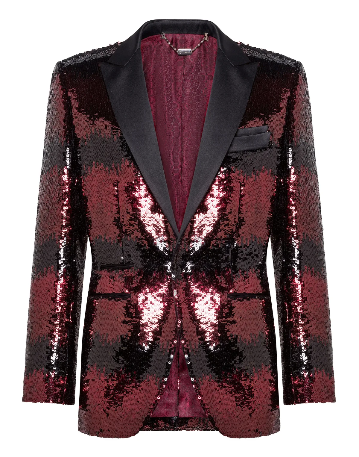 Dit avondjasje met één knoop is bedoeld voor je meest exclusieve avondje uit. Het is gemaakt van een verblekende lovertjesstof met satijnen details op de revers en zakken. Verborgen drukknoopsluiting. Satijn gevoerde manchetknopen. Steekzakken. Split middenachter. Binnenvoering.