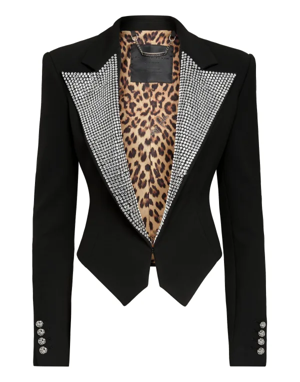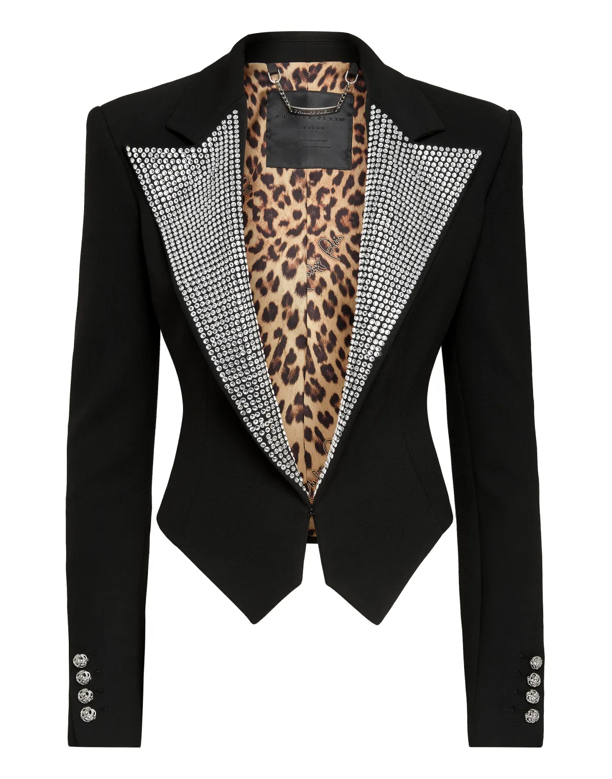 Verfraaid Blazer van stretchwolmix met brede revers bedekt met strassteentjes. Gevoerde schouders. Haaksluiting. All-over bedrukte stoffen voering.