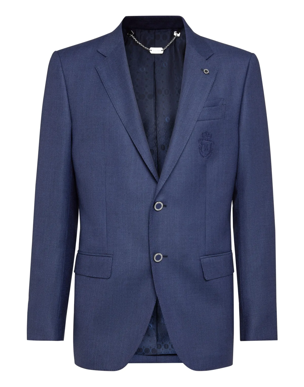 Klassiek en sportief, het geweven wollen jack is een passe-partout die je in je garderobe moet hebben. Deze versie met twee knopen heeft alle basiselementen, inclusief de borstzak. Twee zakken met klep. Het merkembleem is geborduurd op de linkerborst. Metalen knopen met geëmailleerd midden. Twee splitten op de rug. Binnenvoering. Pasvorm: Getailleerd.