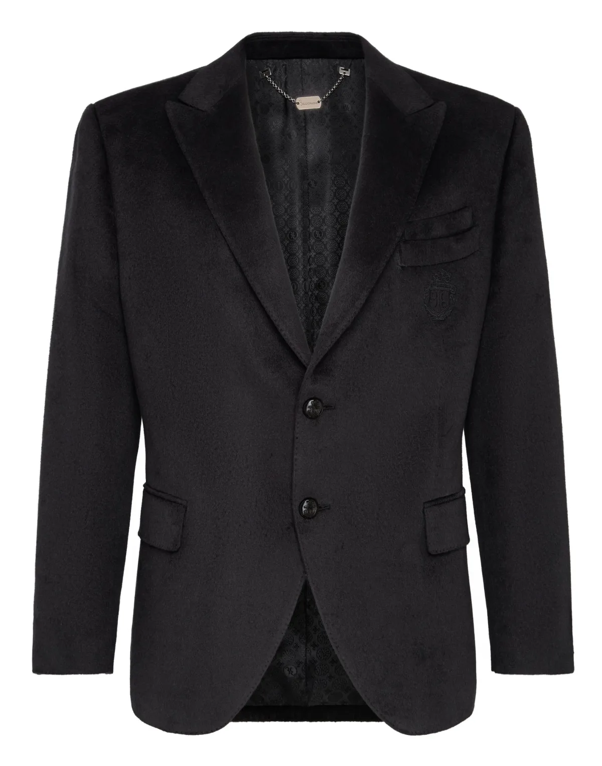 Precious and classy this two button jacket with peak lapel is made of pure silk. The double breast pocket is decorated with the brand's emblem embroidery. Two flap pockets. Horn logoed buttons. Two slits on the back. Inner lining. Fit: Tailored.