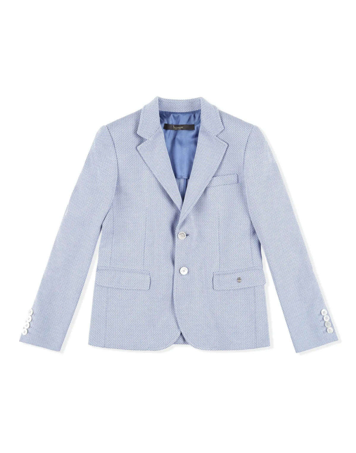 Corporate professional inspiration for this cotton two-button jacket with chevron pattern. Two flapped pockets one of which decorated with the embroidered emblem. Satin lining.
