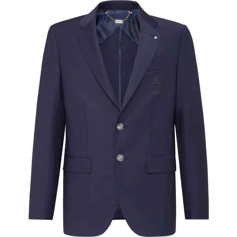 Classic and sporty, the stretch wool jacket is a passe-partout that you need to have in your wardrobe. This two-button version features all the basic elements, including the breast pocket. Two flapped pockets. The brand's crest is embroidered at left chest. Metal buttons are decorated with the logo in relief. Two slits on the back. Unlined. Fit: Super Slim.