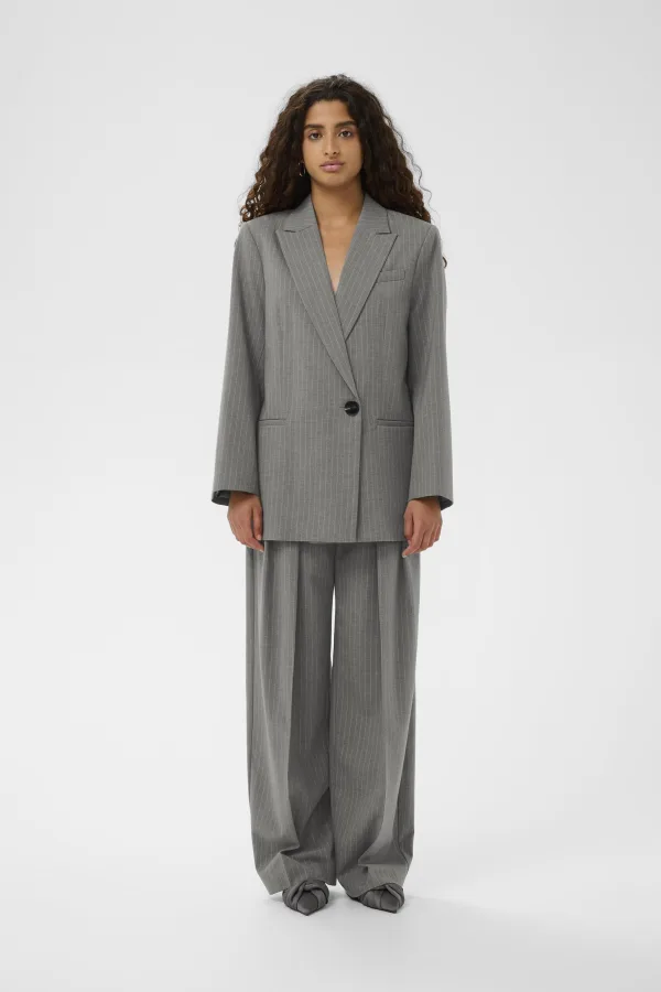 Gestreepte blazer met ruimvallend silhouet, brede revers, gestructureerde schouders, enkele knoopsluiting en voorzakken met paspel.