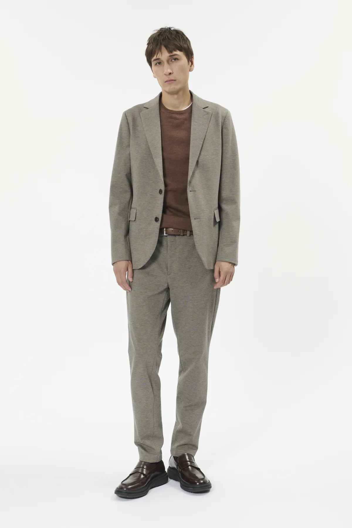 Enkelrij blazer met scherpe revers, gestructureerde rechte pasvorm en klepzakken. Zachte, subtiel getextureerde afwerking geeft een moderne uitstraling.