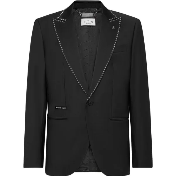 met studs Add a spark to your wardrobe. Check out this wool canvas evening blazer with details that make it stand out. Light wool canvas Satin peak lapel enriched by studs Satin lined single button with embroidered Skull & Bones Two satin trim finished slit pockets Single vent Inner lining
