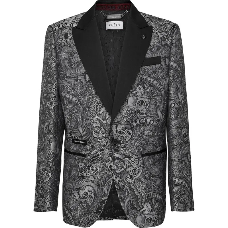 Add a spark to your wardrobe. Check out this wool evening blazer with details that make it stand out. Lurex jacquard-woven Tattoo pattern on light wool fabric Satin peak lapel Satin lined single button with embroidered Skull&Bones Two satin trim finished slit pockets Single vent Inner lining