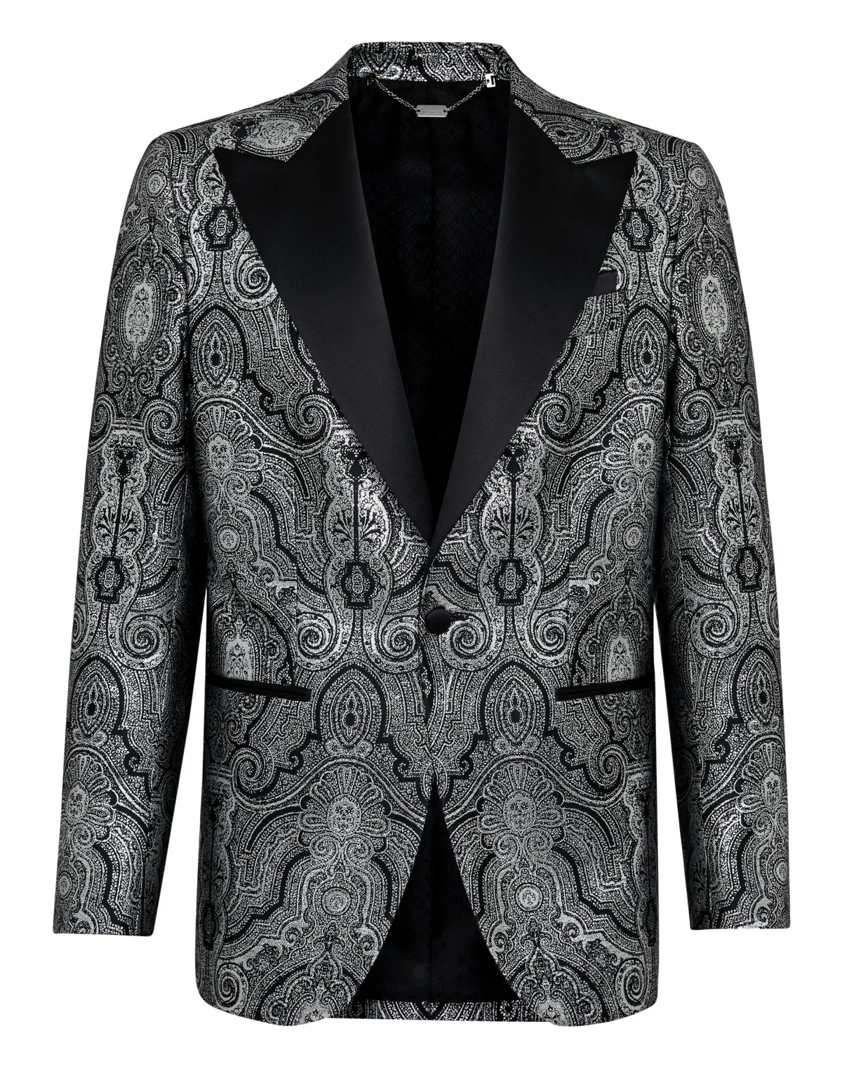 Speciale gebeurtenissen worden beter beleefd met een vleugje originaliteit en dit avondjasje met één knoop heeft het allemaal. De lurex en polyester damast stof is versierd met een jacquard geweven paisley patroon. Zijden revers en met zijde afgezette zakken. Satijn gevoerde schachtknopen. Twee splitten op de rug. Binnenvoering. Pasvorm: Super Slim.
