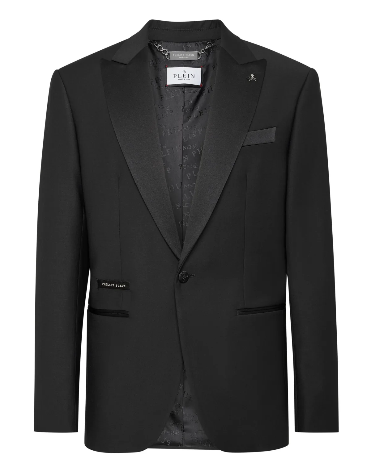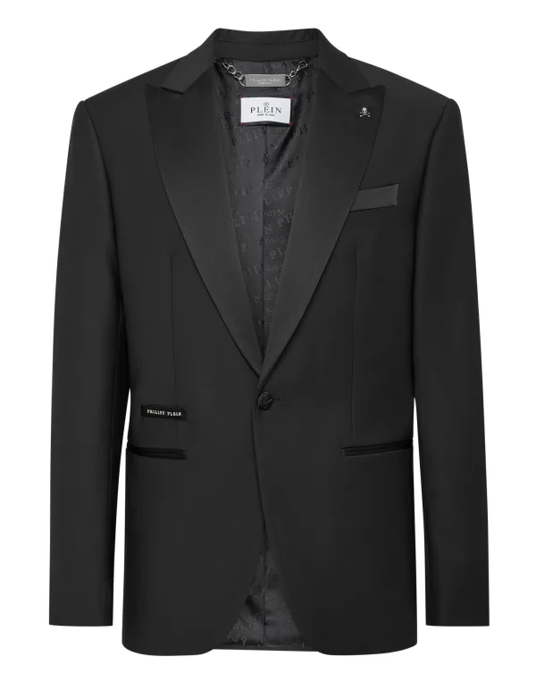 Add a spark to your wardrobe. Check out this wool canvas evening blazer with details that make it stand out. Light wool canvas Satin peak lapel Rhinestoned patch sewn at back Satin lined single button with embroidered Skull & Bones Two satin trim finished slit pockets Two vents on the back Inner lining