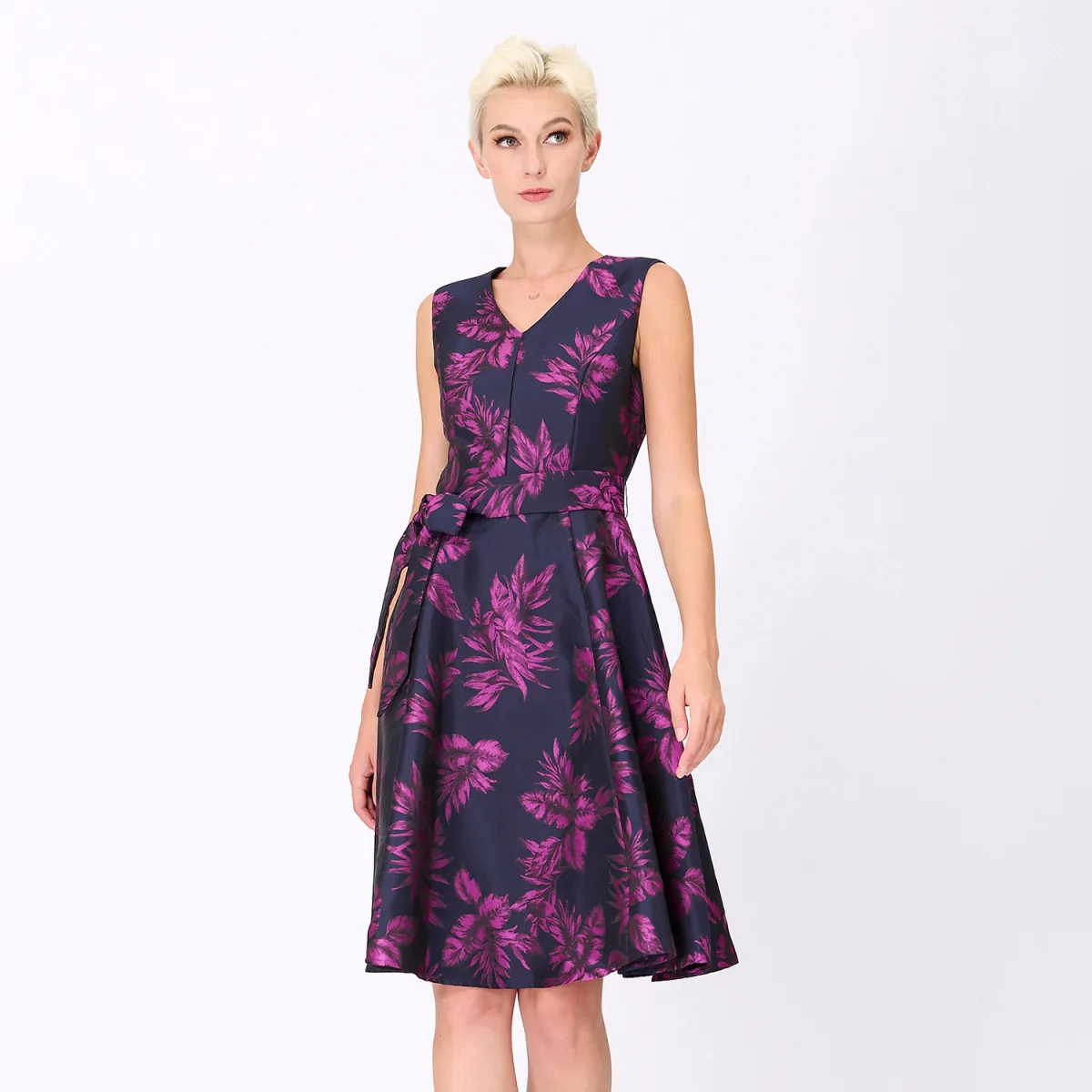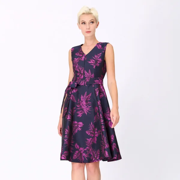 Een jurk die je silhouet benadrukt met glamour en elegantie. Gesproken lijfje, aantrekkelijke V -halslijn maar fatsoenlijke, brede stofgordel die de taille en royaal wijd uitlopende rok onderstreept. Volledig bekleed met satijnen stof, gesneden in een brokaatstof met "tropisch" patroon. Een cocktailitem om te exposeren tijdens je volgende avond of feest. Productdetails: • Formulier: fit-and-flare • Lengte: 101 cm • Zonder mouwen • V kraag • Invisible Zipper Center Back • Toegevoegd riem