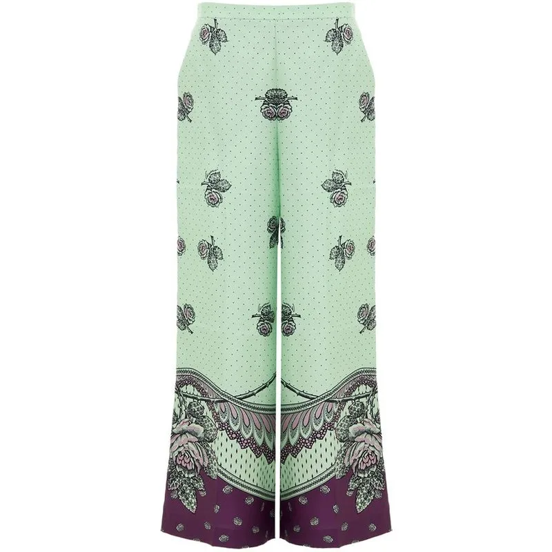 Stap naar buiten, val op en voel je fabuleus in deze zijden palazzo broek. Ervaar ongeëvenaarde elegantie met een levendig bloemenontwerp dat je dagelijks stijl naar een hoger niveau tilt. De wijde snit zorgt voor een comfortabele en flatterende pasvorm, zodat je met gratie en zelfvertrouwen kunt bewegen. De decoratieve rand aan de zoom voegt een verfijnde finishing touch toe. Geniet van het luxe gevoel van zijde op je huid. Perfect om een vleugje verfijnde schoonheid aan elke gelegenheid toe te voegen. Alleen professioneel reinigen om hun onberispelijke staat te behouden.