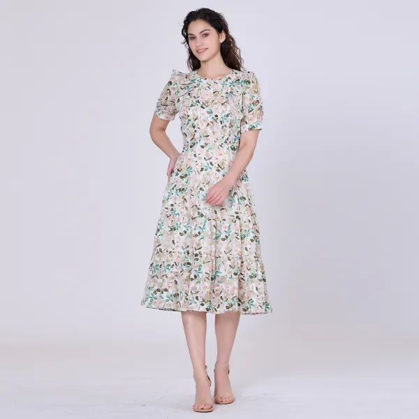 Een licht en romantisch stuk gesneden in een gestructureerde mousseline met verfijnde bloemenprint. Buste gestructureerd door gestikte plooien en ruches. Wandelde rok gemaakt van vermoeide panelen die royaal volume geven. Een sierlijk silhouet met een gepaste taille. Geschikt voor semi-formele gelegenheden zoals een brunch, een tuinfeest of een voorjaarshuwelijk. Productdetails: Lengte: 116 cm Model draagt maat 10 Modelhoogte is 5 "7 Vorm: fit-and-flare Korte mouwen Ronde kraag Onzichtbare rits aan de linkerkant