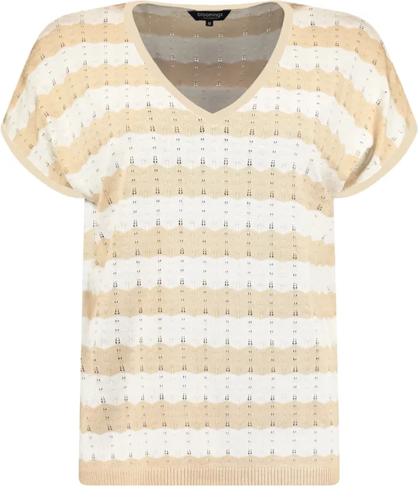 Trui uit truien van Bloomings met V-hals, korte mouwen en regular pasvorm. Het streeppatroon in blauw en wit krijgt extra diepte door opengewerkte details. Draagt luchtig en soepel, ideaal voor casual momenten. Combineer met een lichte jeans of een effen rok.