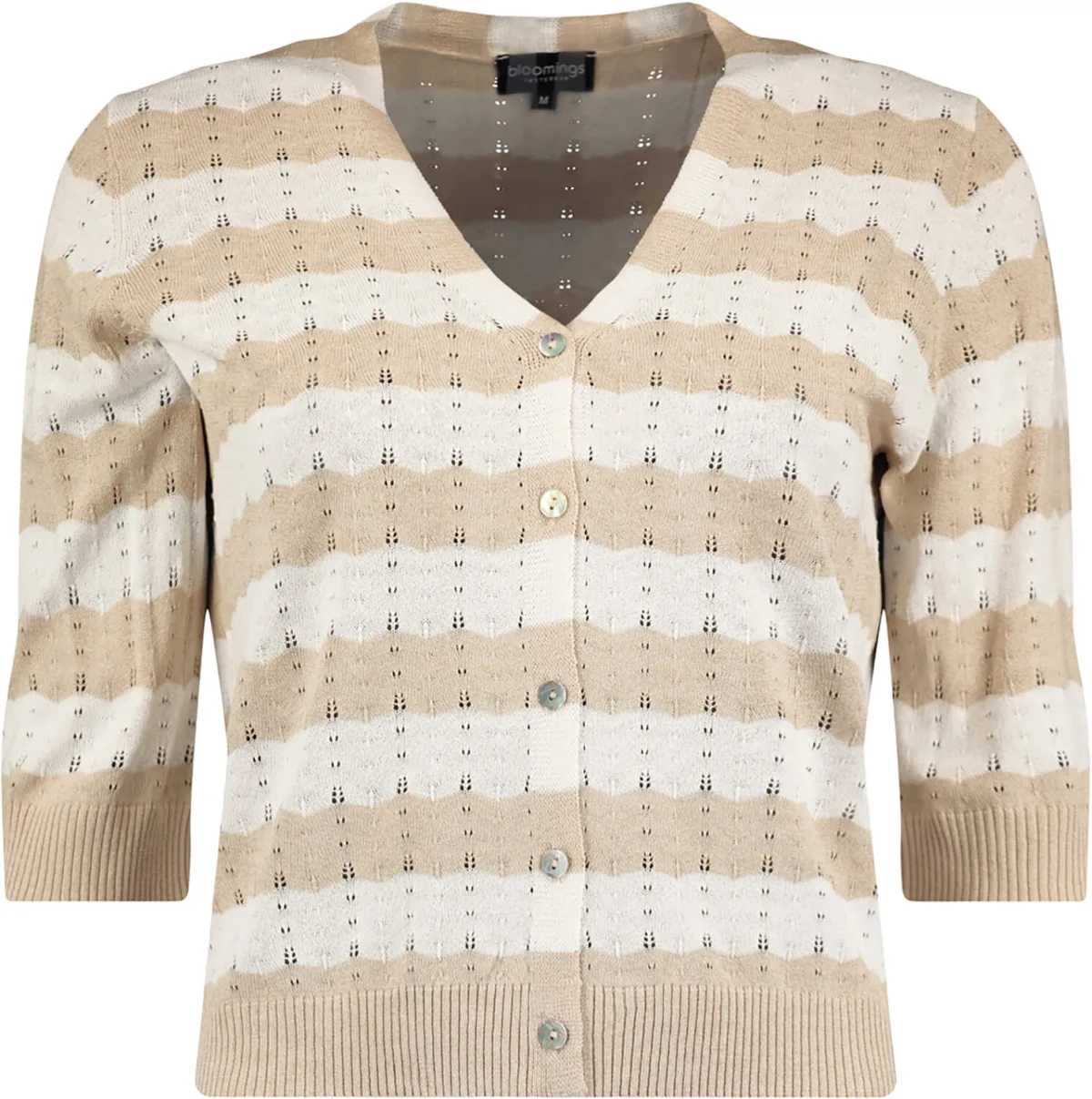 Vest Bloomings met casual uitstraling, V-hals en knoopsluiting. Het streeppatroon in donkerblauw en wit geeft een helder accent. De regular pasvorm en lange mouwen dragen comfortabel. De opengewerkte breistructuur voegt luchtigheid toe. Combineer met een effen top en jeans voor een rustige balans.