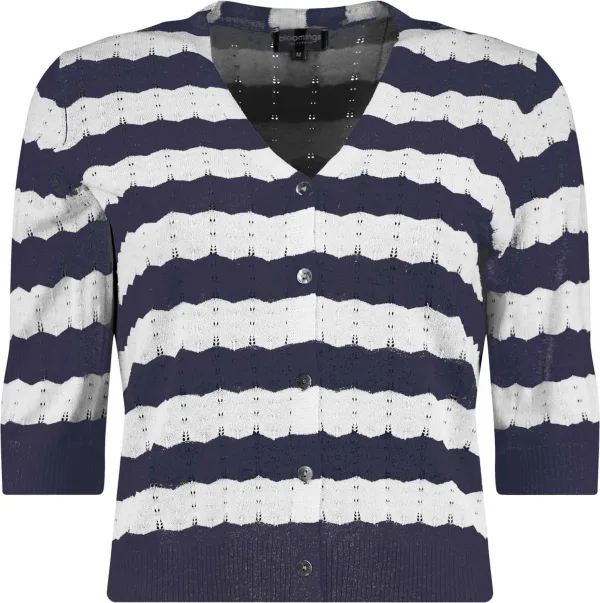 Vest Bloomings met casual uitstraling, V-hals en knoopsluiting. Het streeppatroon in donkerblauw en wit geeft een helder accent. De regular pasvorm en lange mouwen dragen comfortabel. De opengewerkte breistructuur voegt luchtigheid toe. Combineer met een effen top en jeans voor een rustige balans.