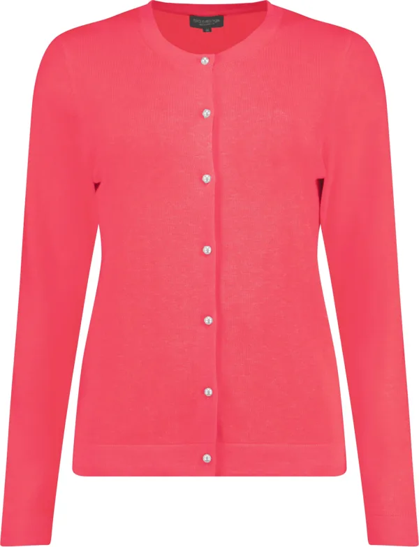 Vest Parel van Bloomings is een vest met ronde hals, knoopsluiting en lange mouwen, uitgevoerd in een effen, felroze tint. De regular pasvorm en minimalistische, casual uitstraling maken het geschikt voor dagelijks gebruik, terwijl de fijne boordafwerking langs hals, zoom en manchetten zorgt voor een nette finish.