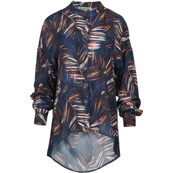 Deze blouse is gemaakt van geweven viscose met een bladprint op een donkerblauwe achtergrond. Het model heeft lange mouwen, hangende schouders en manchetten die worden gesloten met twee decoratieve tweekleurige knopen. Het heeft een mandarijnkraag. Aan de voorkant zit een knoopsluiting met decoratieve tweekleurige knopen. De blouse heeft een ongelijke afgeronde zoom die langer is aan de achterkant.