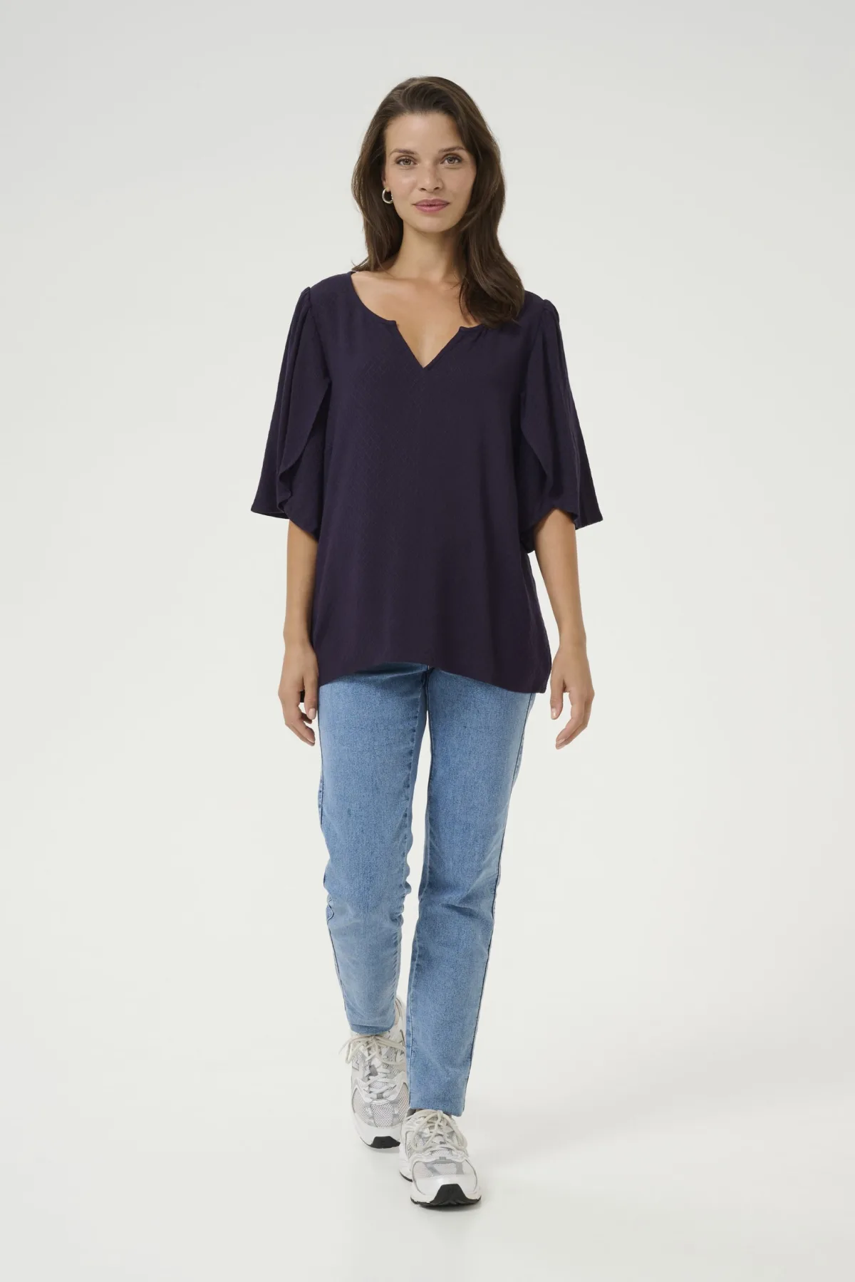 Blouse type: Blouseshirt; Design: Rechte zoom; Materiaal: Viscose; Motief: Effen; Kraag: Tuniek kraag; Details: Gedrapeerd; Extra's: Fijne stof; Pasvorm: Losse pasvorm; Armlengte: Kwartmouw; Lengte: Normale lengte