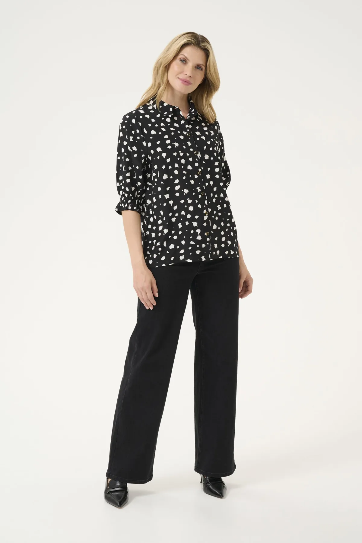 Blouse type: Klassieke blouse; Type sluiting: Knoopsluiting; Materiaal: Viscose; Motief: Gestippeld; Kraag: Kentkraag; Details: Ruches, Gedrapeerd; Pasvorm: Normale pasvorm; Armlengte: Halve mouw; Lengte: Normale lengte