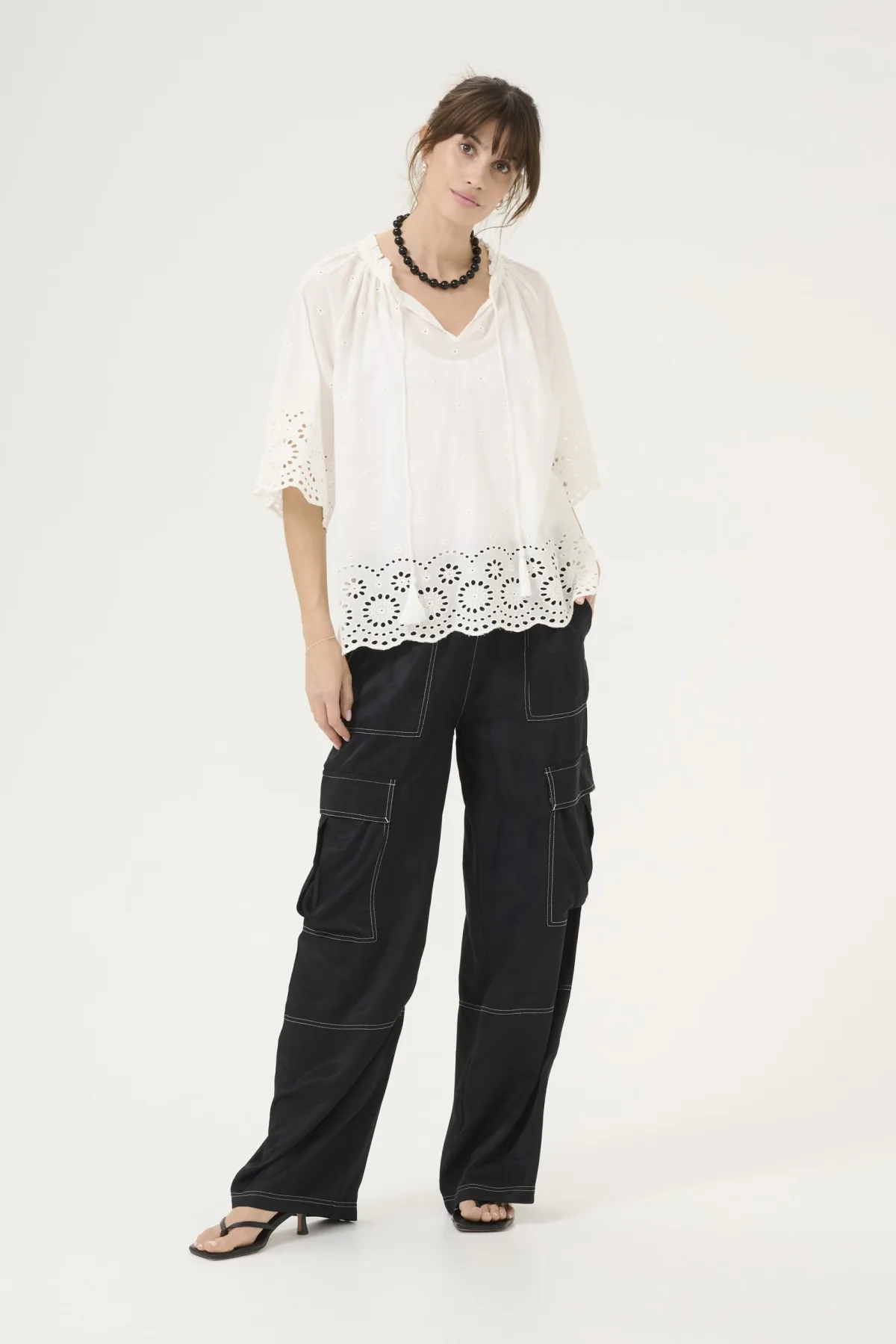 Blouse type: Wijde blouse; Design: Om te knopen/binden; Materiaal: Katoen; Motief: Effen; Details: Mesh; Extra's: Licht transparant, Voelt zacht aan; Pasvorm: Normale pasvorm; Armlengte: Kwartmouw; Lengte: Normale lengte