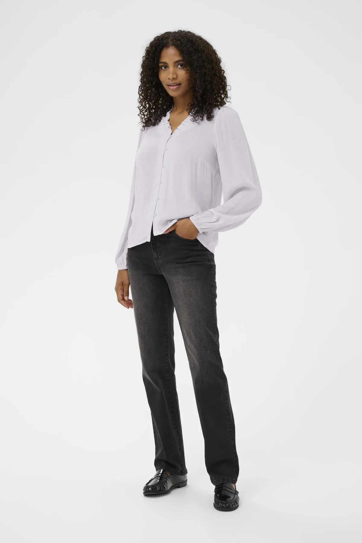 Damesblouse met een comfortabele, losse pasvorm, V-hals en subtiele ruches. Lange mouwen en een doorknoopsluiting maken deze blouse veelzijdig.