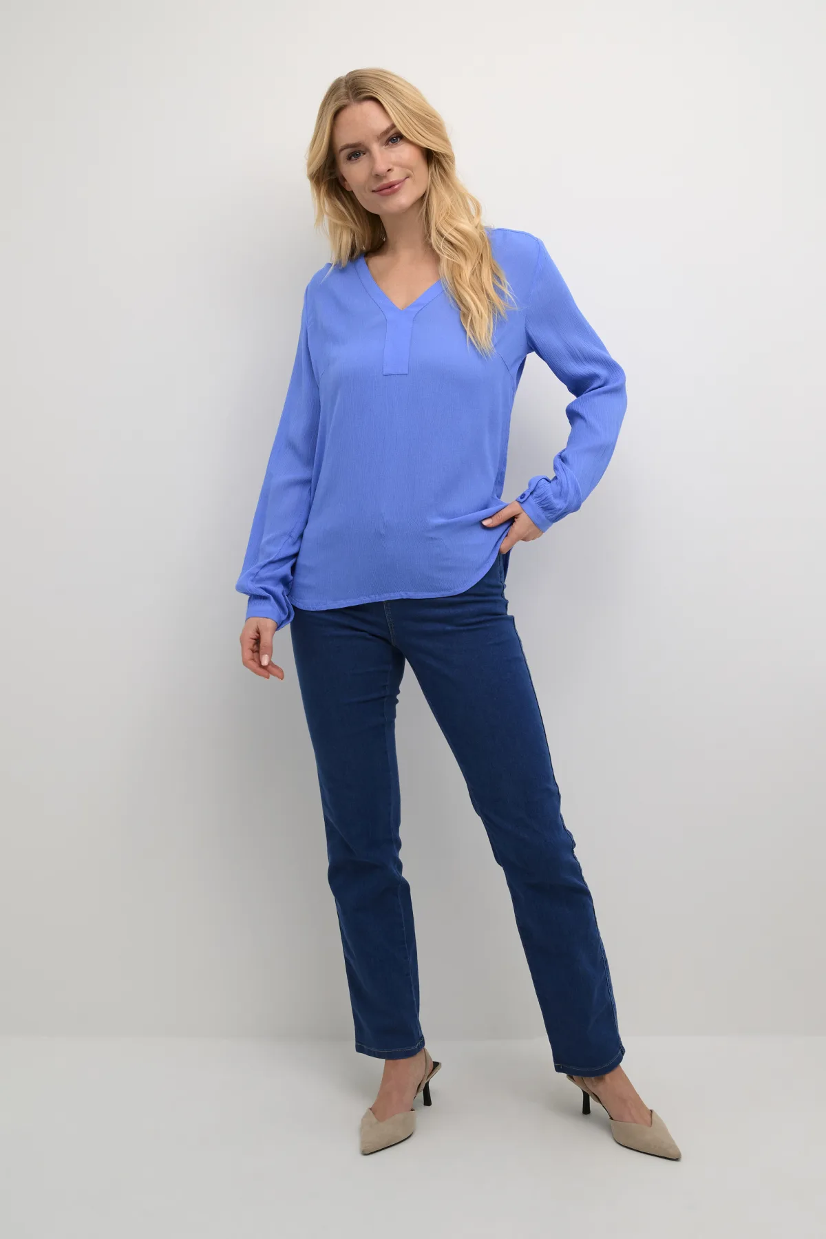 De KAamber blouse is een ontspannen en comfortabele top, perfect voor je dagelijkse garderobe. Het heeft een relaxte pasvorm en een flatterende V-hals met een kaftansluiting. De blouse heeft lange, gerimpelde mouwen met smalle knoopmanchetten. Hij komt op heuphoogte.Snit en materiaal:Pasvorm: normale pasvormLengte: 69 cm komt overeen met maat 40Samenstelling: 100% viscose (LENZING™ ECOVERO™)