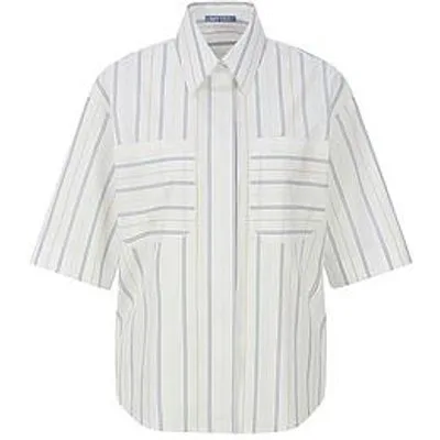 Blouse van DAY.LIKE met korte mouwen. Luchtig, casual, gewoon mooi Prettige wijdte door een plooi onder de pas achter, 2 opgestikte borstzakken met strepen in de breedte en blinde doorknoopsluiting. 75% katoen, 22% polyamide, 3% elastan. Lengte ca. 68 cm. Machinewasbaar fijnwas tot 30°. chloorbleken niet mogelijk. warm strijken. chemische reiniging. drogen in de droger niet mogelijk. 40, 42, 44, 48