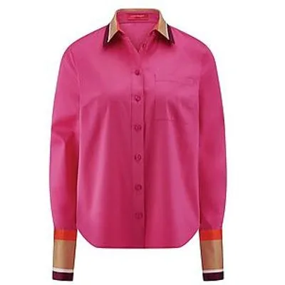 Blouse van LAURA BIAGIOTTI ROMA van zeer fijn katoensatijn. Iets getailleerd overhemdmodel met iets korter voorpand, een stolpplooi bij de pas achter, en omslagmanchetten en kraag met contrastkleurige strepen. Van 97% katoen, 3% elastan. Lengte ca. 68 cm. Machinewasbaar. fijnwas tot 30°. chloorbleken niet mogelijk. koud strijken. niet chemisch te reinigen. drogen in de droger niet mogelijk. 46
