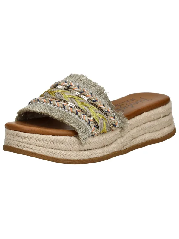 Design: Gevoerd, Hak/zool met raffia-look; Type sluiting: Slip; Type hak: Sleehak; Plateau: Met plateau; Materiaal: Imitatieleer; Schoenneus: Open toe; Extra's: Applicaties; Hakhoogte: Middelhoge hak (3-7 cm)