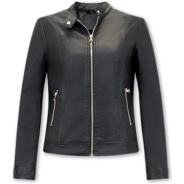 Imitatie Leren Jasje Dames - AY332- Zwart - Specificaties: - Imitatie Leren Jasje Dames- Artikel: AY332- Zakken: 2 zijzakken- Kleur: Zie afbeeldin / zwart- Materiaal: 100% kunstleer- Pasvorm: Getailleerd Slim fit - Kort Heupjack