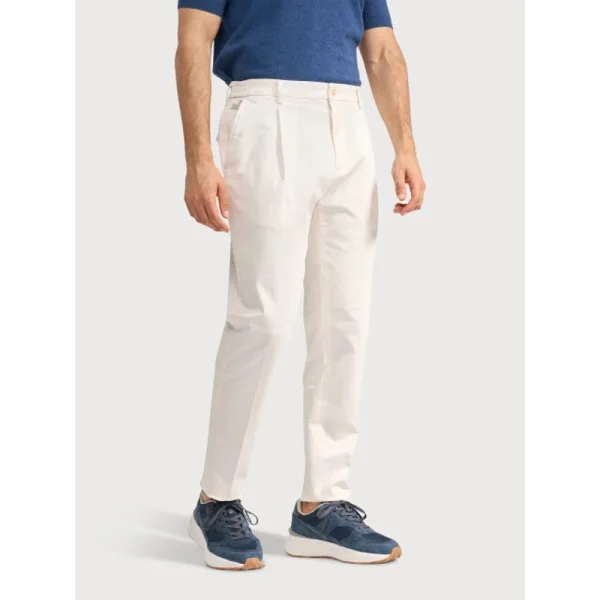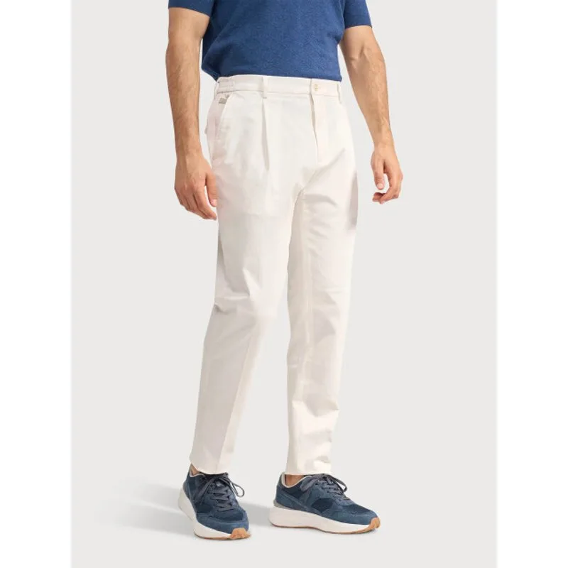 Deze chino is gemaakt van een katoenen stof met elastan en uitgevoerd met een knoopsluiting. Het model heeft een relaxed fit en een wide leg uitvoering. Aan de voorzijde is een bandplooi verwerkt. Op de broek is een subtiele logo badge aangebracht. 97% katoen / 3% elastan Knoopsluiting Bandplooi Wide leg Logo badge Relaxed fit
