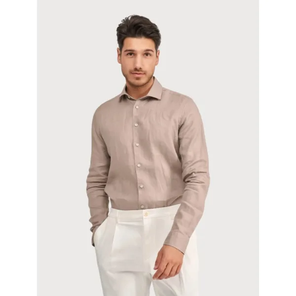 Dit uni overhemd is gemaakt van een katoen-linnenmix en heeft een luchtig karakter met een natuurlijke structuur. Het shirt draagt licht en voelt comfortabel aan, waardoor het prettig is om langere tijd te dragen. De stof geeft het overhemd een rustig oppervlak en zorgt ervoor dat het zowel los gedragen kan worden als onder een colbert. uni uitvoering katoen-linnenmix 55% linnen / 45% katoen natuurlijke structuur knoopsluiting regular fit