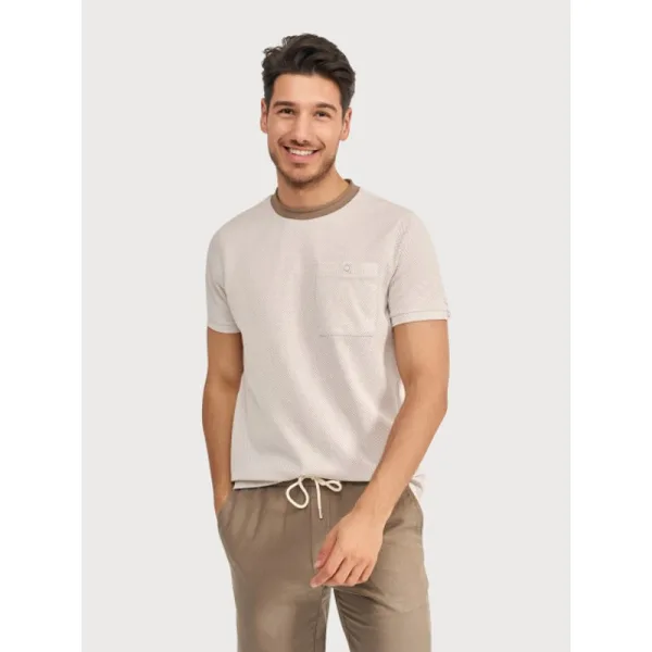 Dit T-shirt is uitgevoerd met een ronde hals en heeft een regular fit. Het shirt is gemaakt van een katoenmix en heeft een fijn gebreide microstructuur in het oppervlak. Op de mouw en op de borstzak is een knoopdetail aangebracht, wat zorgt voor een onderscheidend afwerkingsdetail binnen het ontwerp. 87% katoen / 13% polyester Fijn gebreide microstructuur Ronde hals Borstzak Knoopdetail op mouw en borstzak Regular fit