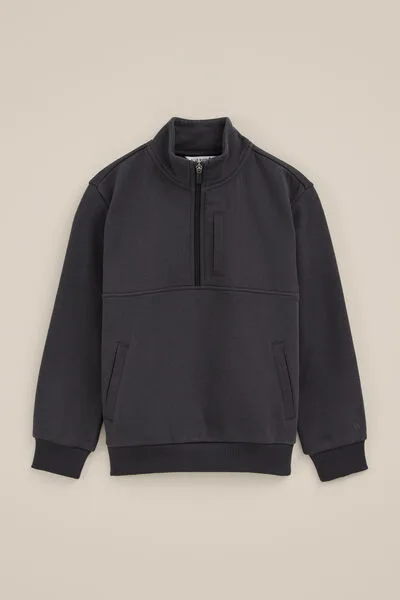 Stoer, zacht en helemaal z’n stijl. Deze sweater heeft een regular fit, een opstaande kraag met halve rits, lange mouwen met ribboorden, een borstzak én een handige buidelzak.