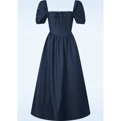 “Made for wandering through wildflower afternoons.” Deze midi jurk is voorzien van een rechte halslijn met speels ric-rac randje, een vast strikdetail, korte pofmouwtjes die off-shoulder gedragen kunnen worden, een aansluitend lijfje en loopt vanaf hier uit in een flowy midi rok met een verstevigende band aan de onderzijde. Ze is uitgevoerd in een soepele, luchtige donker denimblauwe stofmix (stretcht niet!), die heerlijk draagt en perfect is voor het komende seizoen! * Midi jurk * Gevoerde top * Plooitjes bij de buste met een vast strikdetail * Korte pofmouwtjes die off-shoulder gedragen kunnen worden * Aansluitend lijfje * Elastisch smock achterzijde * Verstevigde zoom onderzijde rok * Rits en haaksluiting achterzijde * Valt bij een lengte van 1,70 m tot halverwege de kuit
