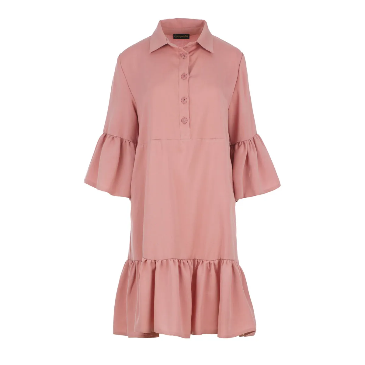Deze Blush Pink Tencel Overhemdjurk is gemaakt van geweven stretch poplin stof. Het heeft klokkende mouwen van ¾ lengte. De jurk heeft een kraag en een sluiting in de taille met plastic knopen. Een naad onder de buste zorgt voor een perfecte pasvorm. De jurk heeft een brede zoom met ruches. De jurk heeft een losse pasvorm en valt boven de knie.