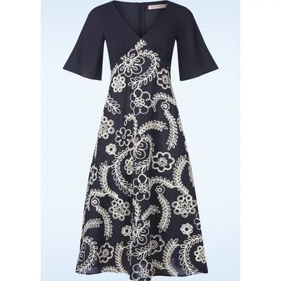 “Light, airy, and beautifully refined.” Deze prachtige midaxi-jurk heeft een elegante V-halslijn met plooitjes, korte vlindermouwtjes en een flowy rok die heerlijk met je mee zwiert. Ze is uitgevoerd in soepele en luchtige 100% katoen in donkerblauw, met een broderie-achtige bloemenprint in gebroken wit. * Midaxi- jurk * Geplooide V-halslijn * Korte vlindermouwen * Blinde rits achterzijde * Valt bij een lengte van 1,70 m over de kuit