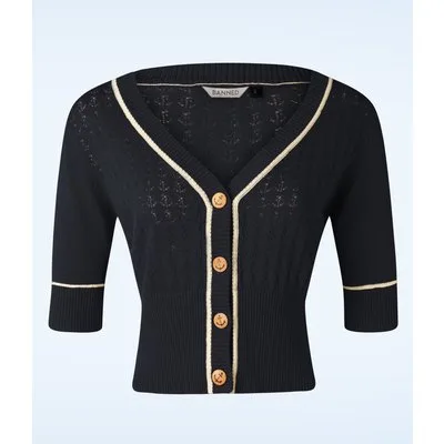 Gaat jouw hartje ook sneller kloppen van deze Boat Club Cardigan in Navy? ;-) Ze heeft een V-halslijn, 1/2 mouwen en houten knopen met ankertjes. Uitgevoerd in een zachte, fijngebreide, navyblauwe viscose-/katoenmix met een heerlijke stretch, een opengewerkt ankerpatroon en crèmekleurige biezen. ''Love at first sight!'' * V-halslijn * 1/2 mouwen * Reeks houten knopen * Elastische ribboorden