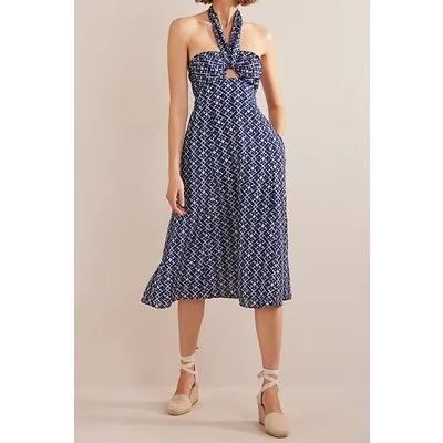 Boden Halterneck Cut Out Midi Dress Prussian Blue, Tranquil Geo